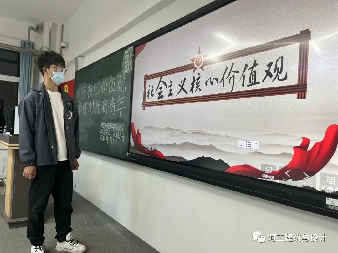 为了深入学习贯彻党的二十大精神,进一步加强大学生爱国主义教育,培育和践行社会主义核心价值观,鼓励广大学生坚定不移听党话,不忘初心跟党走,砥砺奋进,增长本领,为全面建设社会主义现代化国家贡献青春力量。特此,建筑与设计学院团务部于4月6日举办“践行社会主义核心价值观,争做时代新青年”的主题团课活动。