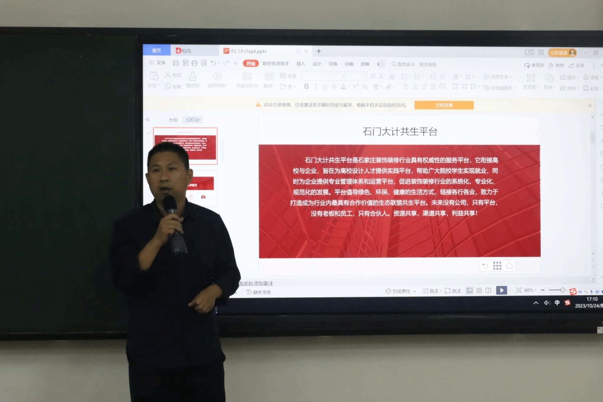 讲座伊始,石门大计共生平台创始人邢景龙围绕“什么是职业生涯规划、为什么要做职业生涯规划以及如何做职业生涯规划”三方面开展。结合当前就业形势以及具体案例,他建议同学们提前规划,抓住机遇,通过自我认知、职业认知、规划实施等,进一步明确职业目标与发展方向。同时表示石门大计共生平台将以促进大学生就业为主导思想,积极提供职业培训、就业指导、专场招聘等服务,促进校企结合,助力学生就业。