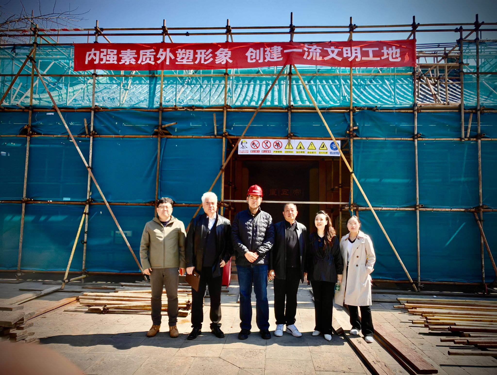 参观历代帝王庙 | 现场指导学生 | 与学生乔直及实习负责人在施工现场留影 |