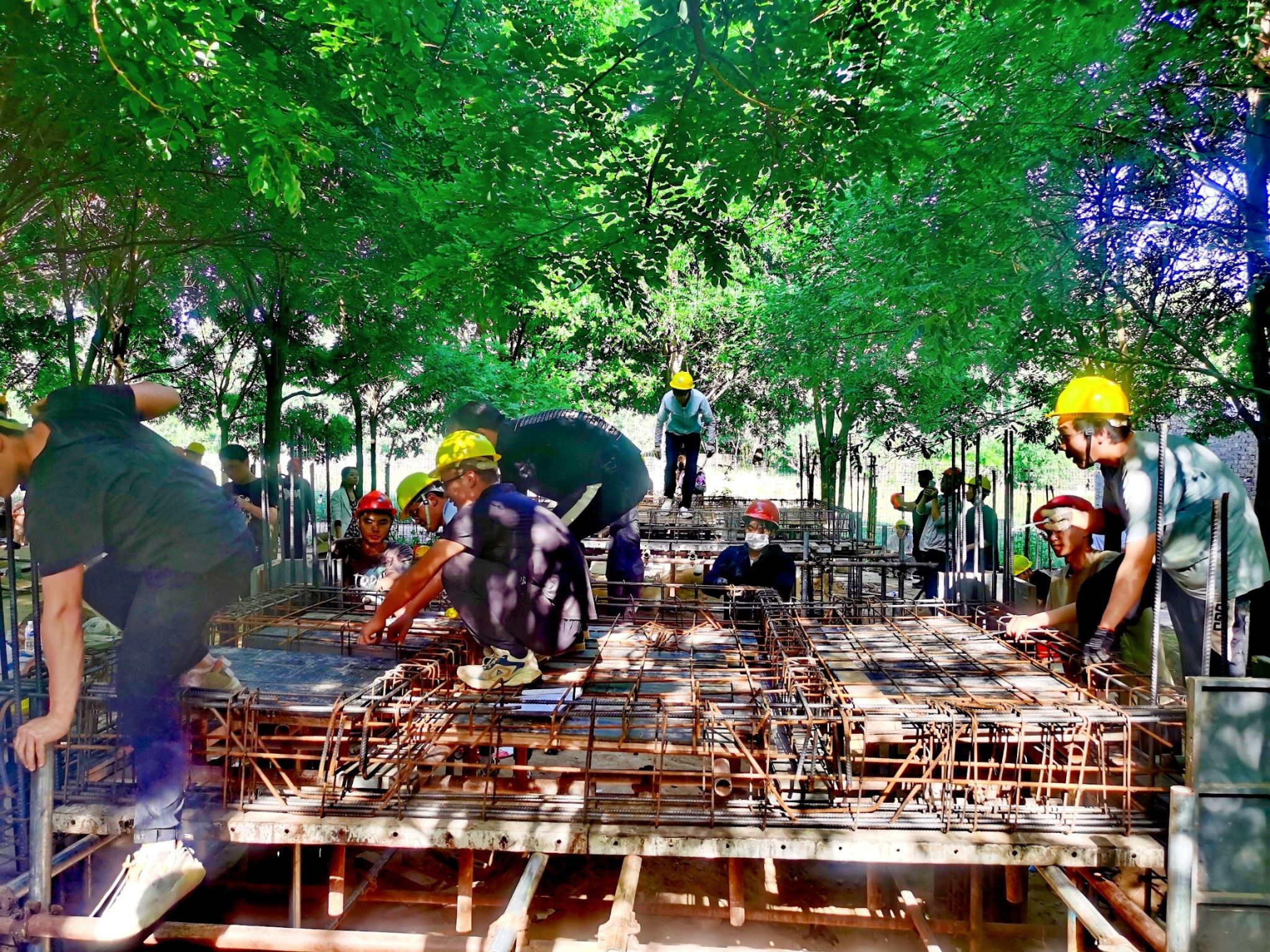 在本次生产实习中,同学们挥汗如雨、热情高涨,从定位放线、土方开挖,到垫层施工、基础施工、柱筋绑扎、脚手架搭设、模板搭设、梁筋板筋绑扎,以及期间的质量控制、进度控制、成本控制、安全管理等,工程造价、土木工程、工程管理专业2021级学生深刻地体会了框架结构的每一个主要生产环节。建筑电气与智能化专业则完成了建筑物室内配电系统的设计与安装实习,包括图纸会审和算量、SC管及电源线敷设、室内电气设备定位与安装、配电控制箱配盘、线路检测与验收等任务。