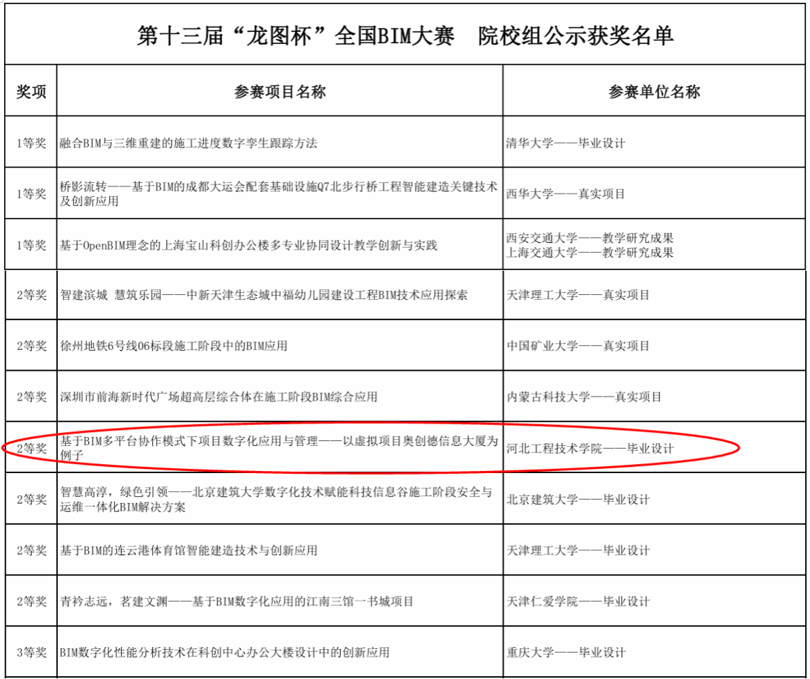 近日,第十三届“龙图杯”全国BIM大赛落下帷幕,由3044永利集团官网赵利军老师指导参赛的两支队伍发挥出色,荣获全国二等奖和优秀奖。