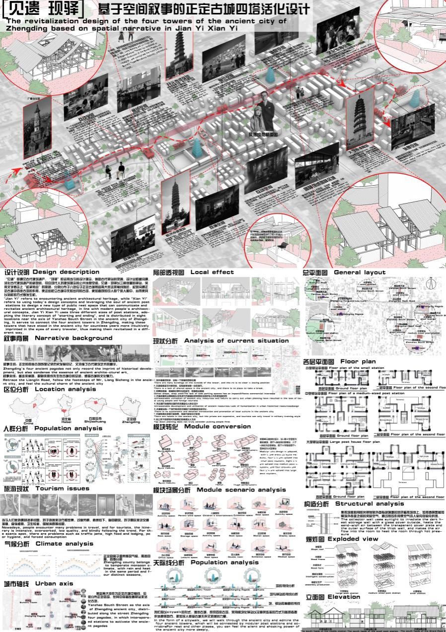 本次获奖作品主题为《见遗 现驿》,基于空间叙事的正定古城四塔活化设计。“见遗”即遇见古代建筑遗产,“现驿”即运用当今的设计理念,借助古代驿站的灵魂,设计出能够沟通、活化古代建筑遗产的新型的,符合现代人对建筑理念的公共休息空间。见遗·现驿以三种体量的驿站无数岁月的古塔,采用文学概念上"起承转合"的思路,分别分布于八处位于正定古城燕赵南大街这条轴线附近,起到沟通正定古城中四座古塔的作用,使这些屹立古城中无数岁月的古塔,更加直观的印入每个旅人眼中,从而使其以别样的方式焕发生机。