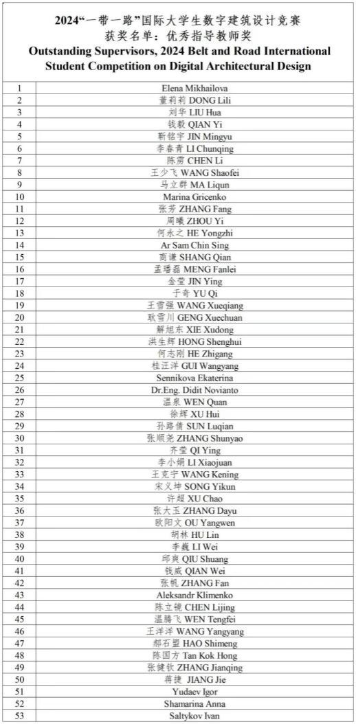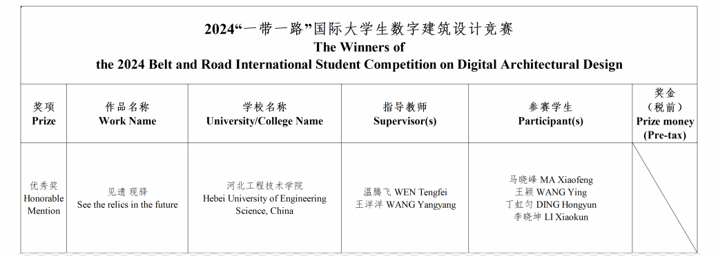 由“一带一路”建筑类大学国际联盟(BRAUIC)发起,北京建筑大学主办、丝路国际公益基金等单位协办、联合国教科文组织等单位支持的2024“一带一路”国际大学生数字建筑设计竞赛获奖名单公布,永利集团官网荣获优秀组织奖。此次赛事中,我院共组织12名学生,4位指导教师参与此次竞赛,其中马晓峰、王颖、丁虹匀、李晓坤学生团队参赛作品《见遗 现驿》荣获数字化建筑设计方向优秀奖,指导教师温腾飞、王洋洋荣获优秀指导教师奖。