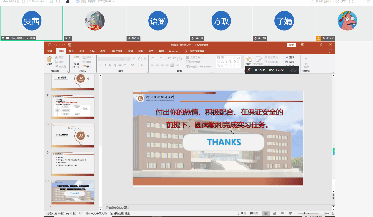 随后,张雯茜老师详细介绍了本次综合实习的具体安排。从实习类型的选择、实习的时间节点,到实习期间需要完成的各项任务等,都一一进行了细致讲解。特别提醒同学们要严格遵守实习单位的规章制度,注重自身安全,并与指导教师保持密切沟通,遇到问题及时反馈和解决。