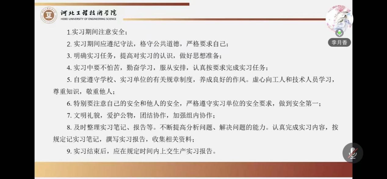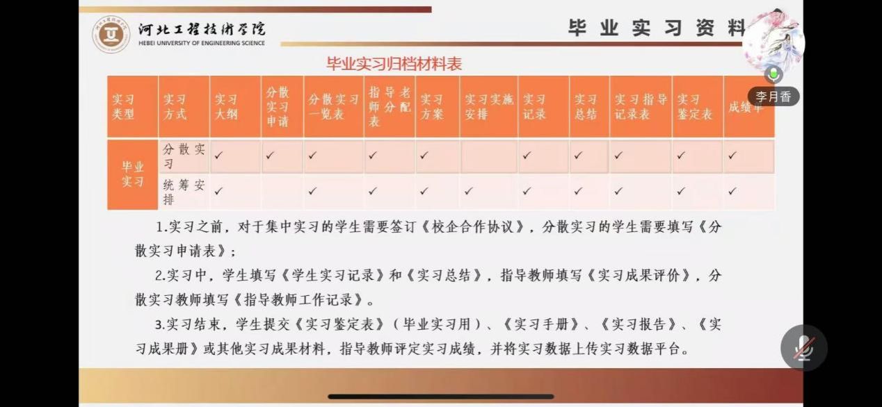 工程管理系副主任李月香,在毕业实习动员会上,首先对毕业实习课程、目的、形式及安排进行了说明。其次,详细列出了实习所需的各类资料清单,确保学生们在实习过程中能够有备无患,高效开展工作。此外,还特别强调了实习期间需要注意的若干事项,包括实习安全、实习纪律、以及时间管理等,旨在引导学生们以专业、严谨的态度面对即将到来的挑战。