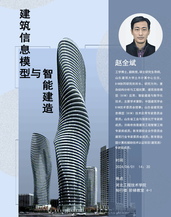 我院邀请山东建筑大学土木计算中心主任赵全斌博士,为我院师生进行建筑信息模型与智能建造专题讲座。赵全斌博士是中国建筑学会BIM分会理事、山东省建筑信息模型专委会委员。作为该领域的专业人士,赵博士对于这一领域的研究有着深入的了解和独到的见解。他具有丰富的教学和科研经验,在学术界享有很高的声誉。他将通过生动的案例和详实的数据,向师生传递最新、最有价值的学术成果。