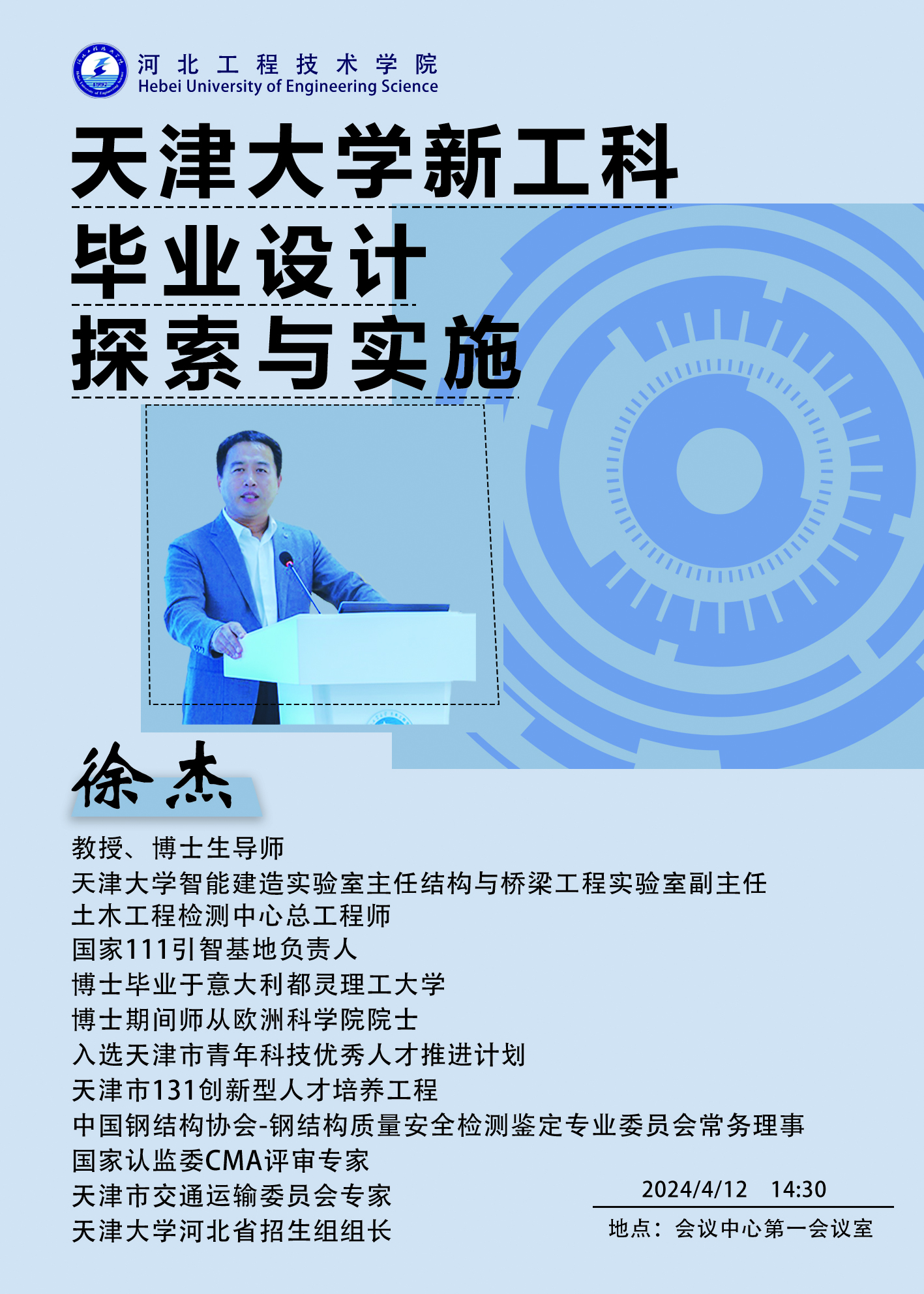 主讲人简介:徐杰,教授、博士生导师。天津大学智能建造实验室主任、结构与桥梁工程实验室副主任、土木工程检测中心总工程师,国家111引智基地负责人。博士毕业于意大利都灵理工大学,博士期间师从欧洲科学院院士、第13届国际断裂力学学会主席Alberto Carpinteri教授,于2013年3月被天津大学引进回国。入选天津市青年科技优秀人才推进计划、天津市131创新型人才培养工程。中国钢结构协会-钢结构质量安全检测鉴定专业委员会常务理事、国家认监委CMA评审专家、天津市交通运输委员会专家,天津大学河北省招生组组长。长期从事智能建造新技术、结构智能监测及低碳绿色高性能材料方向研究。近年来主持及省部级国家级科研项目12项,重点工程委托项目20余项;发表高水平SCI论文60余篇,撰写英文著作2部及参编1部;获国际授权发明专利3项,国内发明专利7项,实用新型专利20余项,软件著作权6项,开发监测系统1套;在多个国内外学术组织兼职,是美国土木工程学会(ASCE)会员、美国科技学会(AASCIT)会员、国际建筑工程与土木工程会议(AECE2016)学术委员会委员、第14届国际断裂力学大会(ICF14)学术委员会委员;担任国际期刊Frontiers in Materials、Big Data and Cloud Innovation和Journal of Computer Science Research编委,国际期刊Applied Science、Sensor特邀编委;Construction and Building Materials、Structural Health Monitoring等10多个重要SCI期刊审稿人。