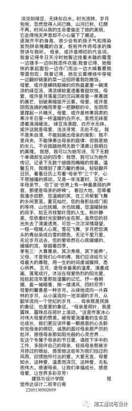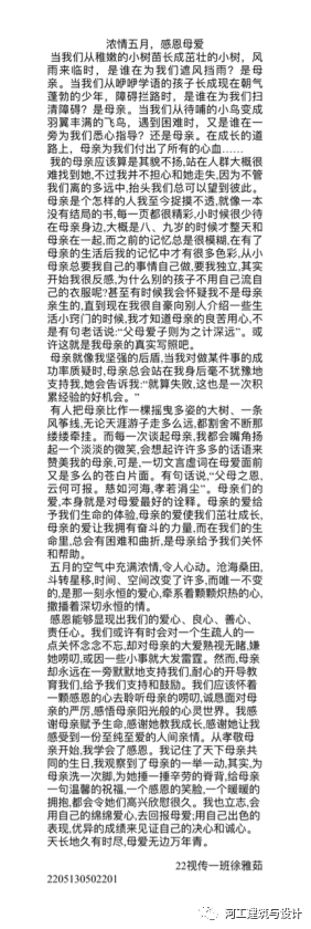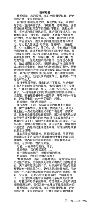 为了帮助学生们树立积极健康的心态,搭建表达爱的平台;为了帮助学生抒发藏在内心出的那一抹柔情,,表达对母亲的感恩和爱意;为了丰富同学们的课余生活,弘扬中华民族传统美德,凝聚和提升孝母感恩的道德风尚,充分发挥永利集团官网的优良传统感恩教育,展现建筑与设计学院优秀学子们的新时代风貌;建筑与设计学院社团联合会于2023年5月11日~5月12日举办“浓情五月,感恩母爱”征文活动。