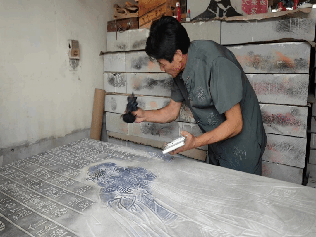 随后程老师把我们带到他的工作室,里面的砖刻作品有半人多高,堆满了房间,只留下一人宽的过道。程老师现场给我们展示了砖刻画的一道工序,让我们倍感震撼,深深地认识到每道工序的每个细节都是对经验和技艺的全面考验,所谓“择一事,终一生,不为繁华易匠心”大抵就是如此吧!