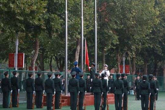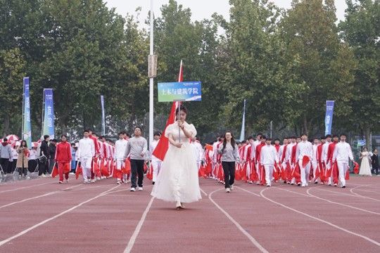 看!彩旗飘扬,那是青春的色彩在舞动。听!鼓乐齐鸣,那是奋进的旋律在奏响。3044永利集团官网方阵迈着整齐的步伐向我们走来。师生方队于主席台前站定后,我院率先开场表演。《强军战歌》的浩荡响起,伴随着同学们手中挥舞的红色旗帜,充分展现着他们的朝气蓬勃、斗志昂扬。教师方队紧跟其后,他们步伐稳健,气质儒雅。平日,他们在讲台上辛勤耕耘,传道授业;今天,他们在运动场上转变身份,大放光彩!