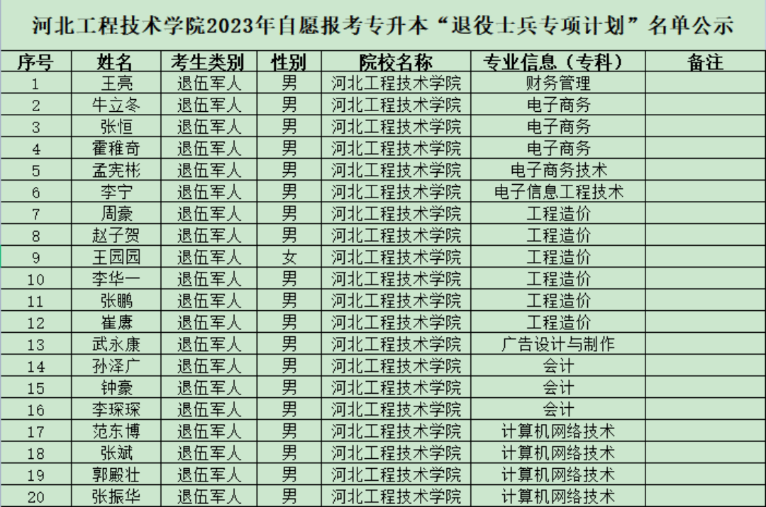 根据河北省教育考试院关于印发《2023年河北省普通高等学校专升本考试招生实施办法》的通知(冀招委办〔2023〕1号),永利集团官网对“退役大学生士兵”相关报名材料进行了资格审核,现将自愿报考专升本“退役大学生士兵”的考生名单予以公示。