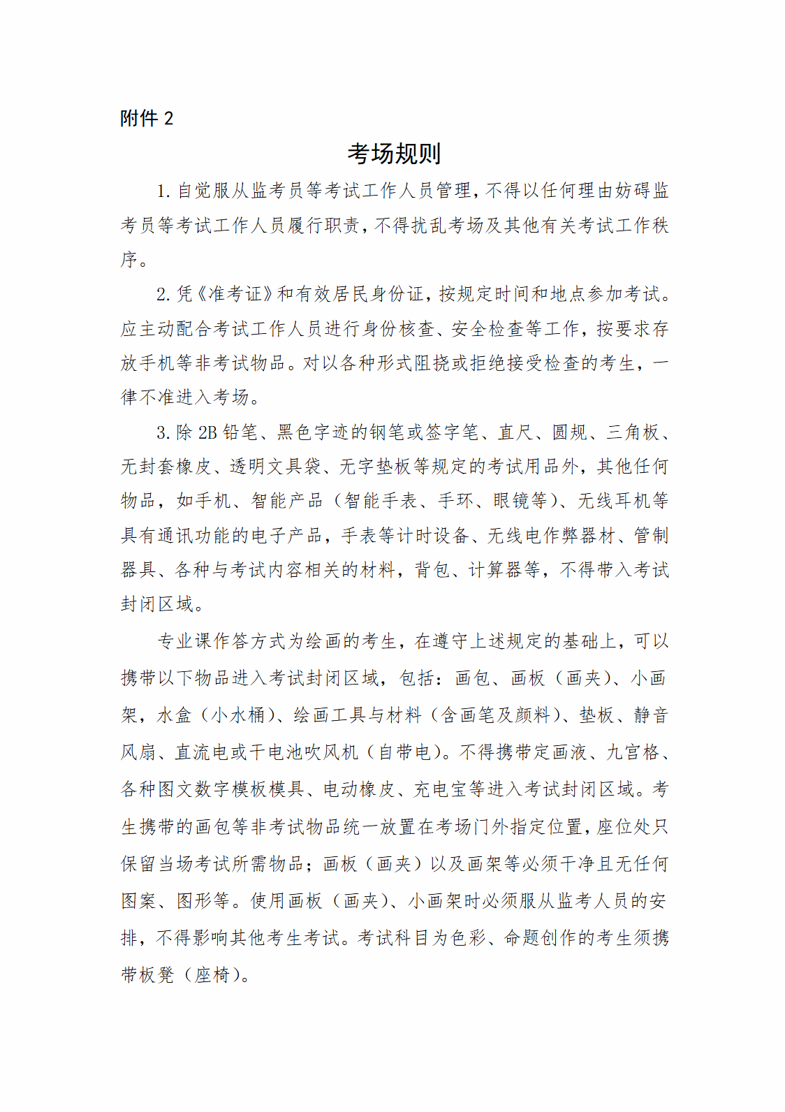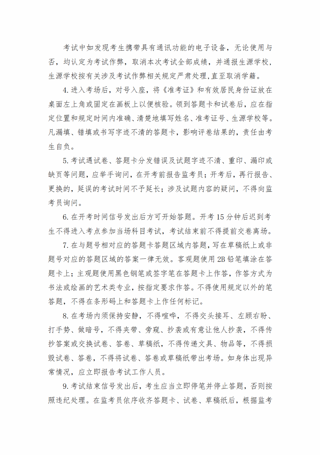 3.严格遵守法律法规。考场内均安装视频监控系统,考试期间全程录像。考生须自觉遵守《考场规则》(附件2),配合考试工作人员做好身份验证和违禁物品检查。对于不遵守《考场规则》、不服从监考员等考试工作人员管理等违规行为,将按照《中华人民共和国教育法》《国家教育考试违规处理办法》等法律法规严肃处理;涉嫌犯罪的,移送司法机关追究法律责任。